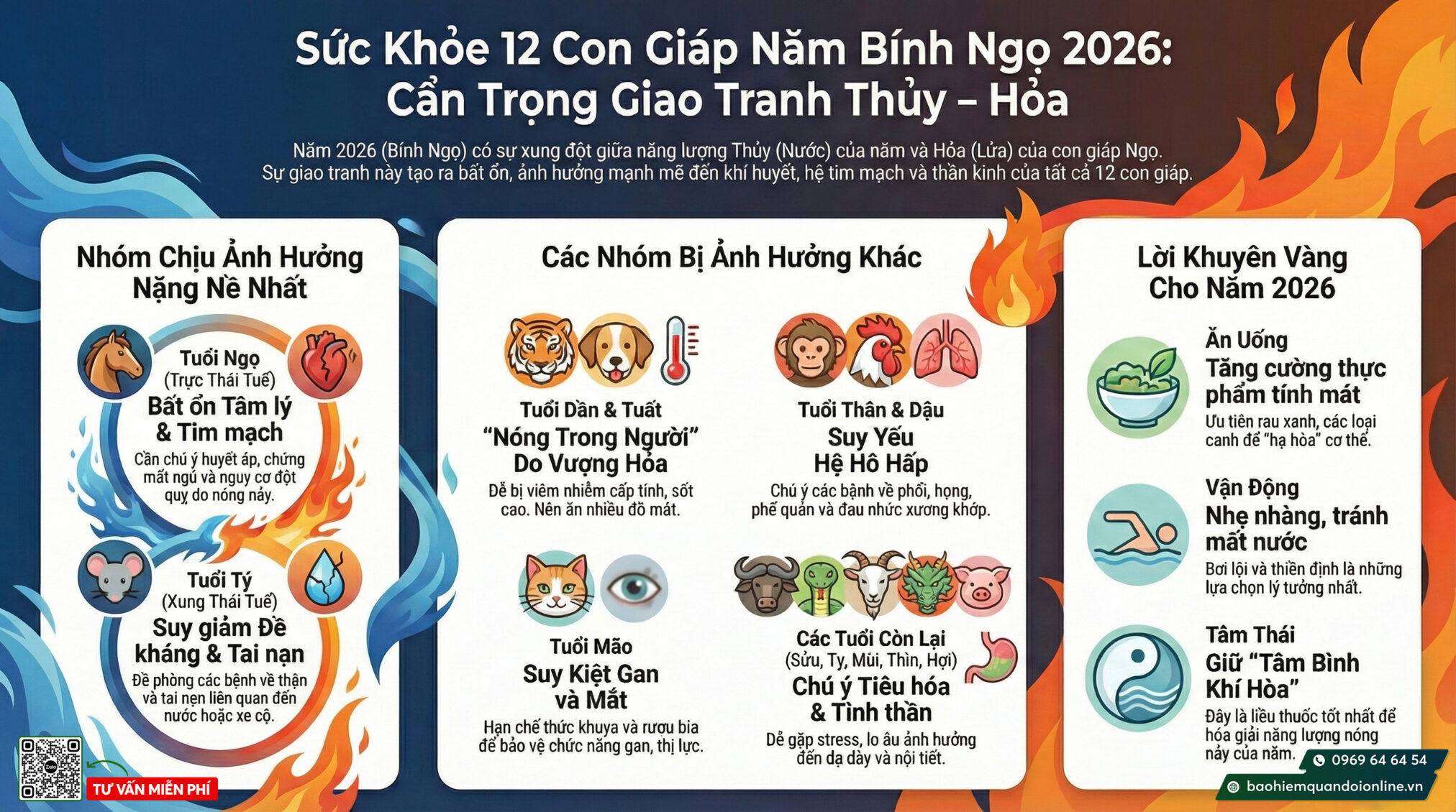 Dưới góc độ tử vi học, năm 2026 (Bính Ngọ) mang nạp âm Thiên Hà Thủy (Nước trên trời), nhưng địa chi Ngọ lại thuộc Hỏa cực vượng. Sự giao tranh giữa Thủy và Hỏa, cùng với đặc tính biến động nhanh của Ngọ, báo hiệu một năm mà sức khỏe của 12 con giáp chịu ảnh hưởng mạnh về khí huyết, tim mạch và hệ thần kinh.