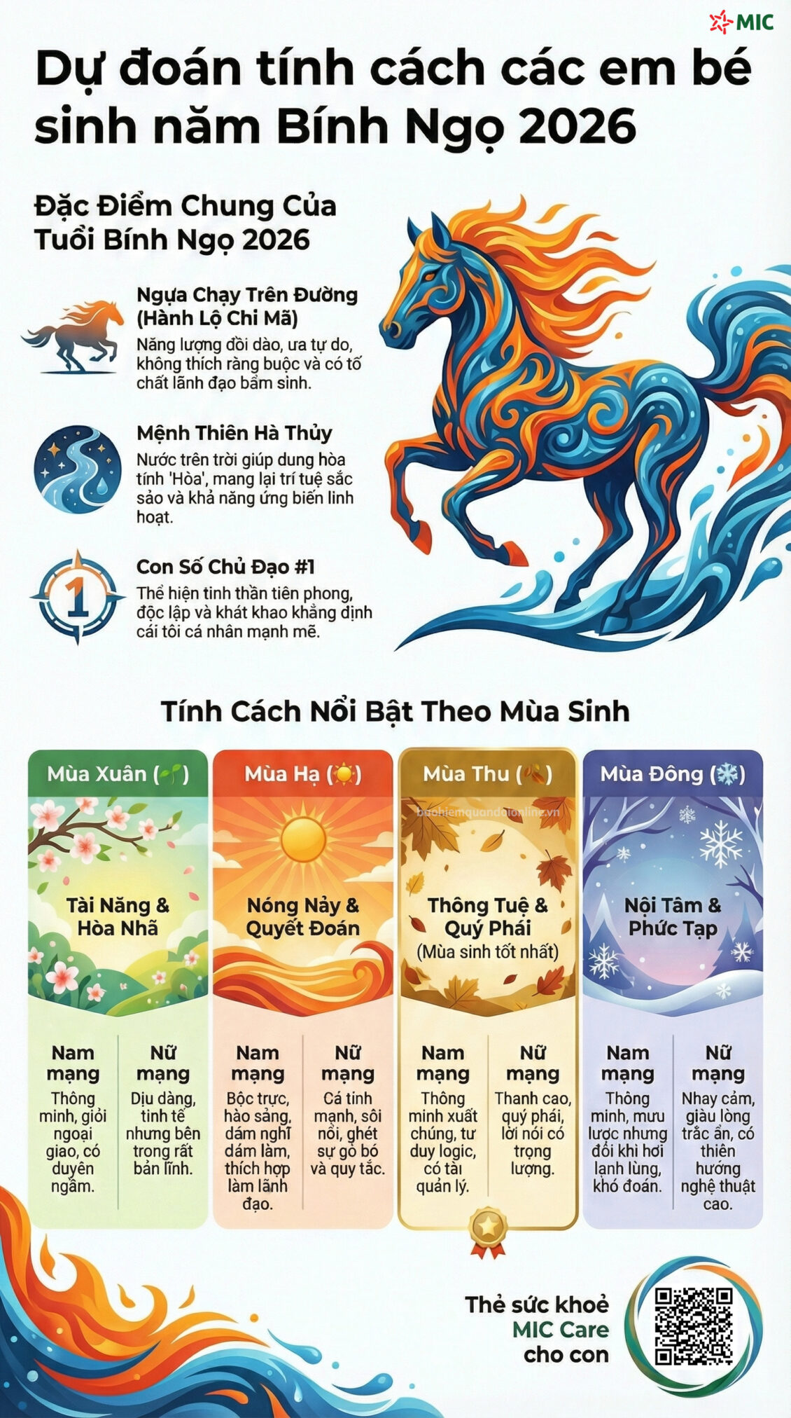 Về Tử vi: Bính Ngọ được ví là “Hành Lộ Chi Mã” (Ngựa chạy trên đường). Đây là những đứa trẻ có nguồn năng lượng vô tận, ưa thích sự tự do, không chịu sự ràng buộc và có tố chất lãnh đạo bẩm sinh. Mệnh Thiên Hà Thủy giúp hạ bớt cái “nóng” của Hỏa, mang lại trí tuệ sắc sảo và khả năng ứng biến linh hoạt.