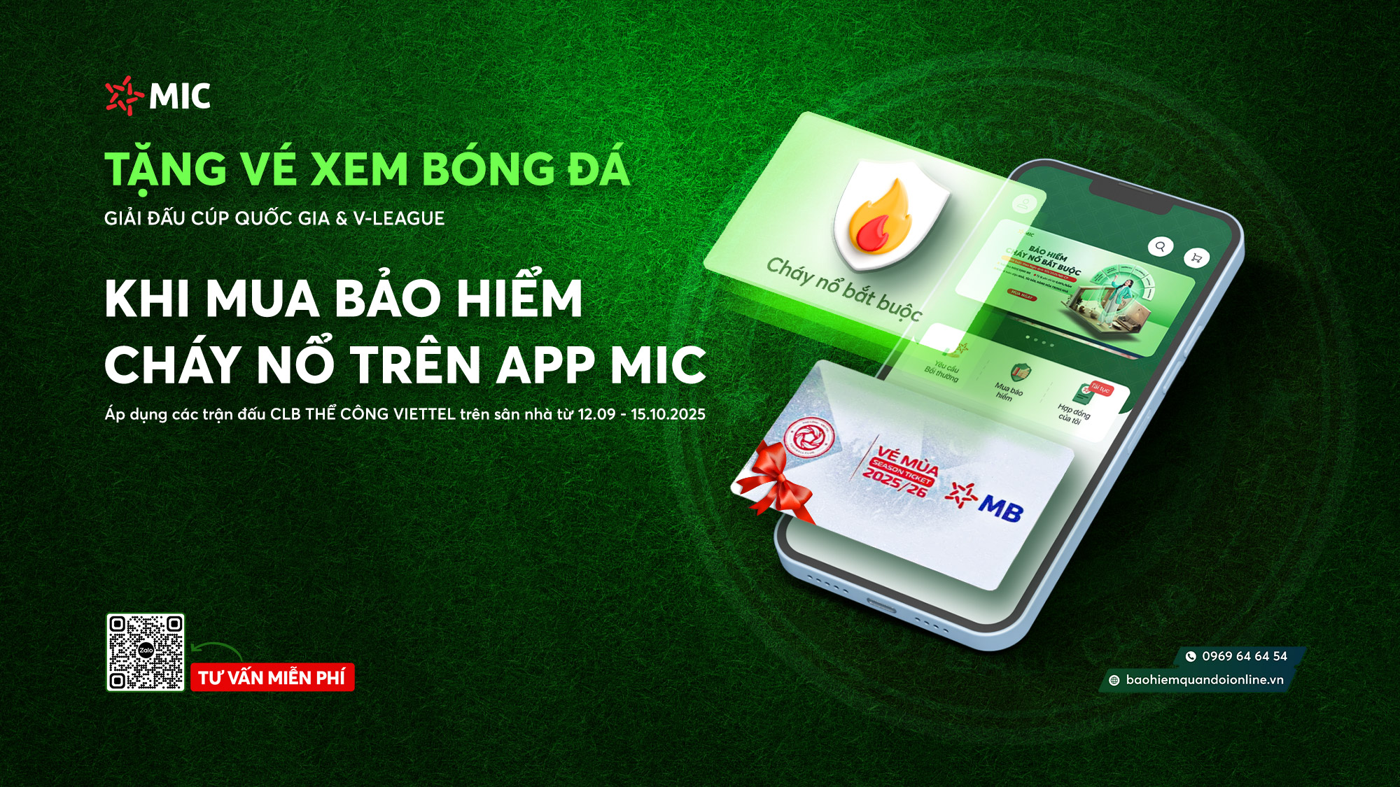 Bảo hiểm Quân đội tri ân khách hàng, Tặng 50 Cặp vé Bóng đá Thể Công – Viettel trọn Mùa giải 2025/2026 (Xem toàn bộ các trận đấu giả VĐQG & V-League trên sân nhà của đội Thể Công – Viettel) cho 50 Khách hàng đầu tiên mua Bảo hiểm cháy nổ trên App “Bảo hiểm MIC” từ ngày 12/9 – 15/10/2025.